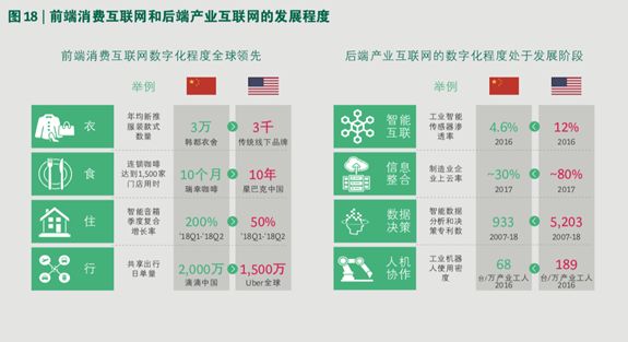 总的来说,中国的前端消费互联网的数字化程度已经在全球处于领先地位,产品与服务广泛地覆盖到了消费者衣食住行各个方面;中国的后端产业互联网虽在智能互联、信息整合、数据决策、人机合作等方面有所发展,但总体数字化程度仍然处于发展阶段。
