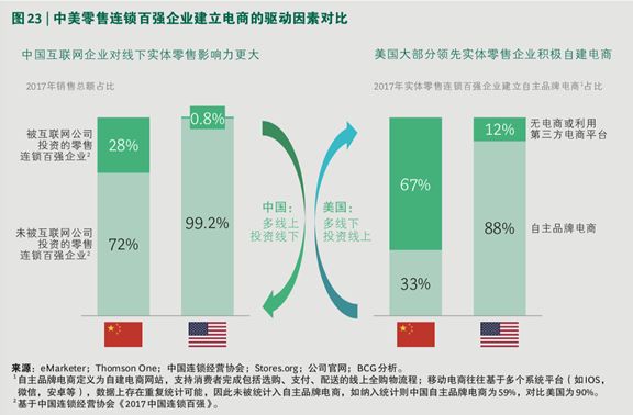 在中国零售百强企业中只有 33% 的企业选择建立自主品牌电商 (自建电商网站不包含移动 APP);但在美国零售百强企业中这个比例达到了 88%。