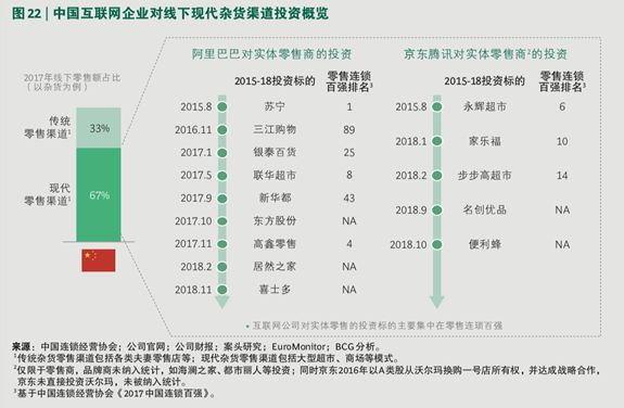 在线下零售额占比达到 67% 的现代零售渠道方面,互联网企业积极地从线上走向线下,大力投资实体零售。