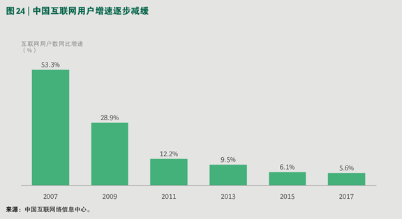 中国互联用户的整体增速逐渐放缓,尤其自 2013 年以来增速下降为个位数,2017 年互联网用户增速仅为 5.6%。因此互联网企业亟待新的业务增长点。