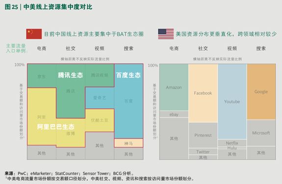 中国的线上流量呈现出三足鼎立的趋势,美国在各垂直领域均有各自不同的领军者或者出现多家竞争的格局,并未形成横跨领域的资源集中优势。