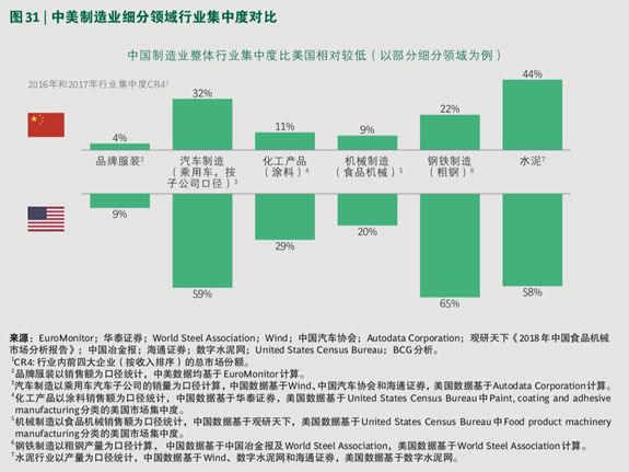以钢铁制造 (粗钢) 和汽车制造 (乘用车,按子公 司口径) 为例,中国行业集中度 CR4 分别为 22% 和 32%,而这一比例在美国则分别达到了 65% 和 59%。这意味着中国制造业存在更多的中小企业。