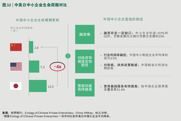 在这些挑战下,中国企业的生命周期偏短。根据《Ecology of Chinese Private Enterprises》的调研,中国中小企业平均生命周期仅为 2.9 年,而美国为 7 年,日本为 12 年。