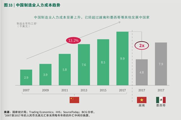 自 2007 年开始,截至 2017 年,制造业年均工资以 13% 以上的增幅逐年上涨。目前中国制造业人力成本已经超过越南、墨西哥等国水平。