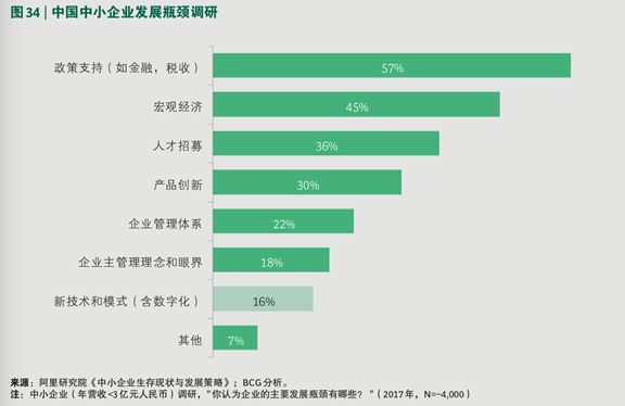 根据阿里研究院针对 4 千个中小企业的调研,仅有 16% 的企业认为包含数字化的新技术及新模式才是企业的主要发展瓶颈。