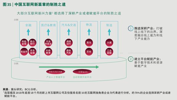 BCG 选取 2018 年底前 18 个月中国新上市的互联网企业和估值前 10 的互联网独角兽企业作为样本分析,70% 的企业都选择了深耕产业或者赋能平台的制胜之道。