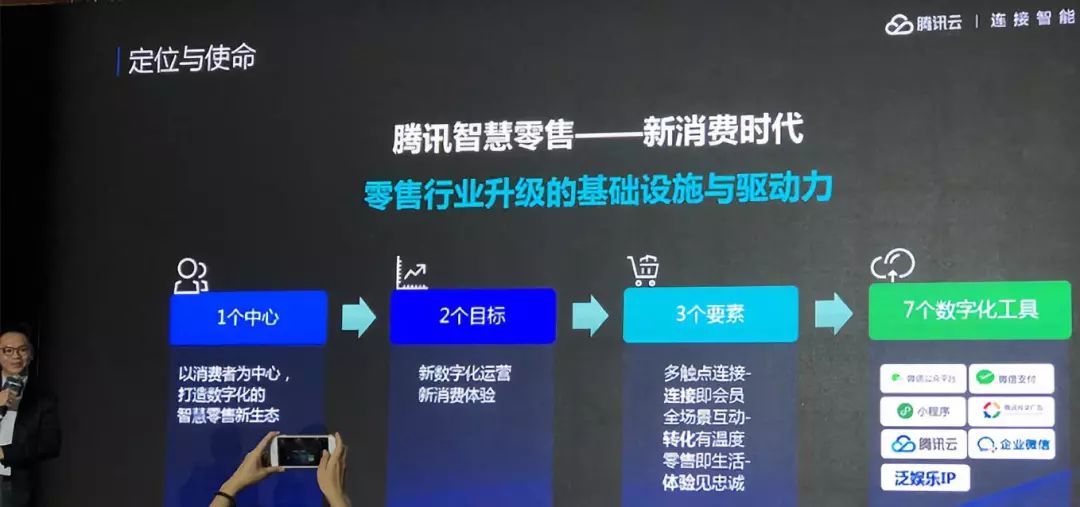 2018年初,腾讯公司也提出了其针对智慧零售的综合性解决方案:1个中心,2个目标,3个要素以及7个数字化工具。具体来说: