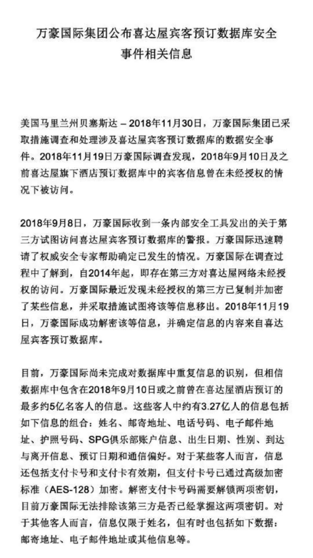 声明透露,目前,泄露信息包含在9月10日之前曾在喜达屋酒店预订的最多5亿名客人的信息。这些客人中约有3.27亿人的信息包括:姓名、邮寄地址、电话号码、电子邮件地址、护照号码、SPG俱乐部账户信息、出生日期、性别、到达与离开信息、预定日期和通信偏好。