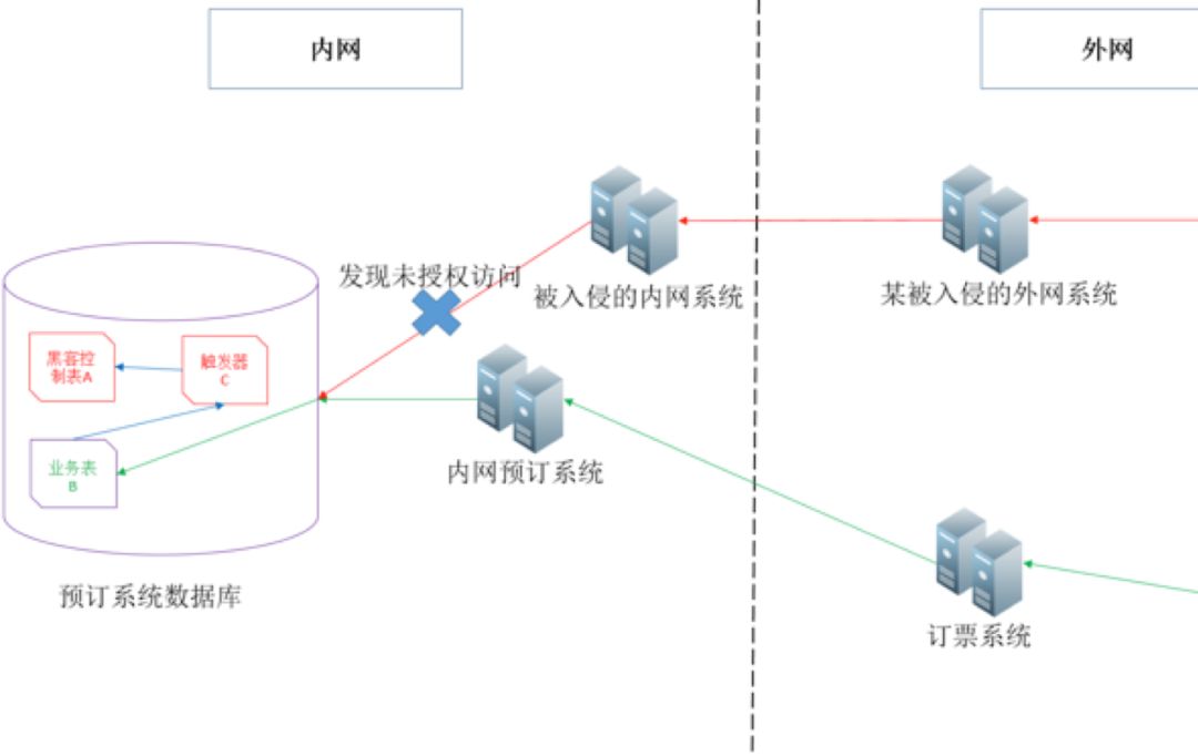 图中红线是黑客拿取数据的路线。黑客沿着自己打通的内网外系统去访问数据库中的表A。结果这次被万豪的安全工具发现。万豪的安全工具很可能是基于访问ip记录,发现的此次未授权访问。