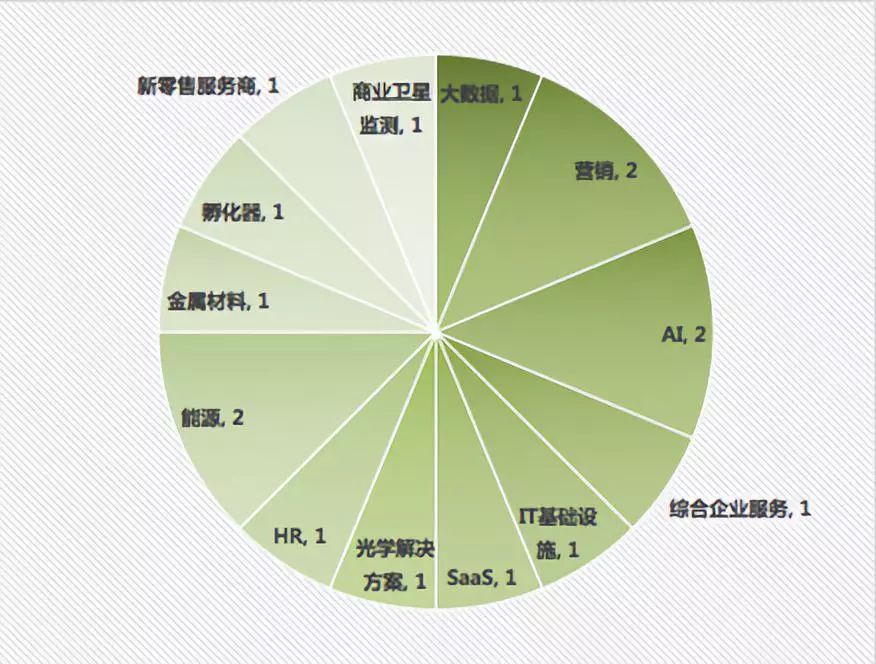 2019年第一周,企服行业就有不少投融资消息,总共收录了16起国内投融资事件,涉及到的细分行业众多。除了一直比较热门的AI、营销、大数据等行业,在能源、光学、金属材料、商业卫星监测等领域,也有项目获得了资本的助力。具体发生投融资事件的细分行业和数量如下图所示: