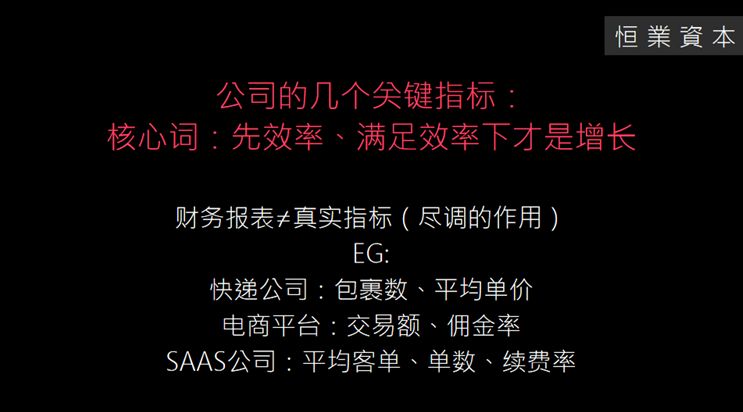 我们明势,首先商业模式,分析行业,公司理论上能拿多少蛋糕,终局获胜之后会如何,终局思维,刚才很多老师都讲了。分析商业模式,公司怎么拿到具备什么能力,来确保成功,可行性。再一个公司增长几个关键指标,增长不是最主要目标,规模性盈利才是,财务报表不等于真实,尽调才是,快递公司、包裹数、平均单价、电商平台、交易额、佣金率、SaaS公司、平均客单、单数、续费率,包括续约金额增长率,等等这些七七八八的东西。包括昨天晚上跟买化塑的CEO郭喜鸿,晚上对数一直对到12点多,也是考虑通过什么方式快速把规模性盈利的能力直接拉起来。