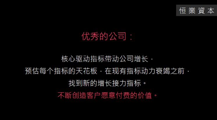 优秀的公司,核心增长指标,带动公司增长,预估每个指标的天花板,现在指标动力衰竭之前,找到新的动力指标。这是现在目前你要做的事。