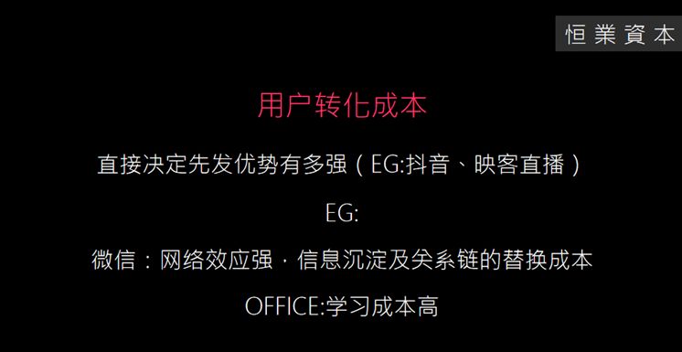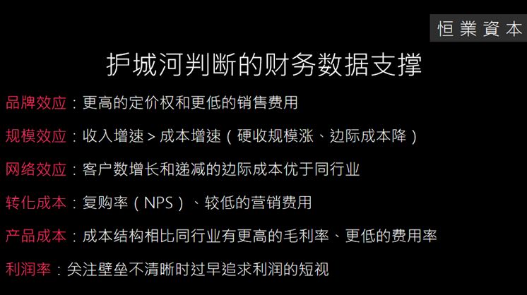 护城河理论:无形资产、网络效应、用户转化成本、产品提供成本,我快点过。无形资产,这是作用,这是网络效应,双边经济模型,用户转化成本,产品提供成本,所有的颠覆式创新标准都降低了30%以上的成本结构,改变成本结构,降低30%的成本,第五个利润率。