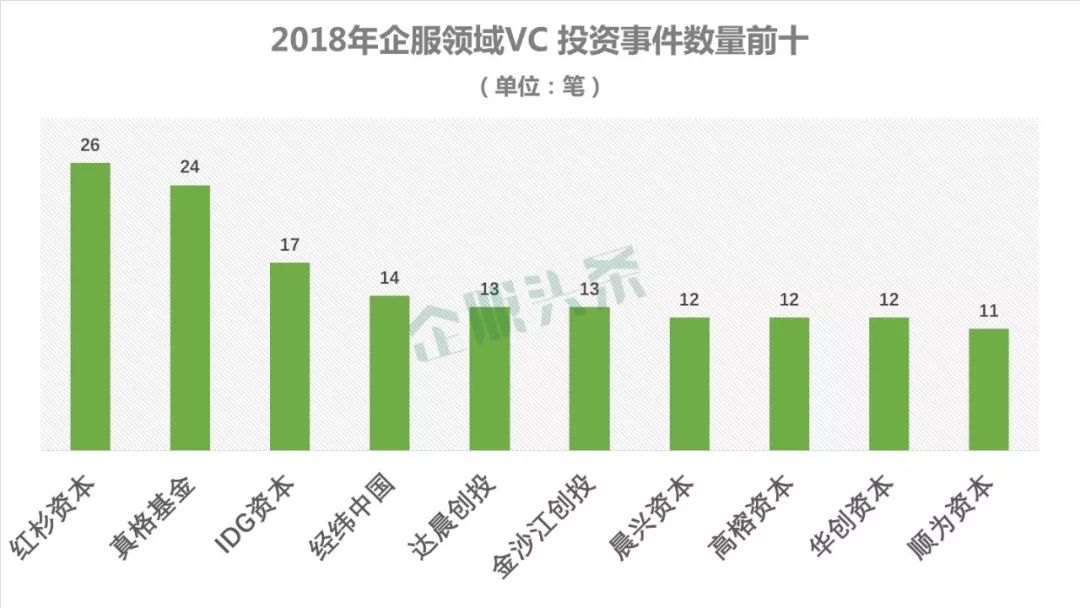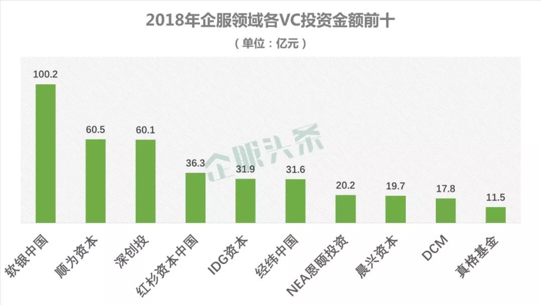 从投资金额来看,排序稍微有些不同,软银中国、顺为资本、深创投等投资机构排在了红杉、IDG、经纬中国和真格基金前面,NEA、DCM等投资机构也在企服领域有大量的资金投入。