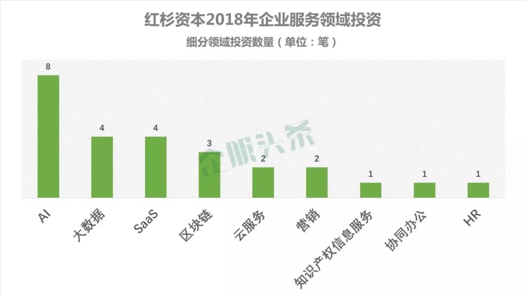 比如红杉虽然在企业服务领域的投资数量较多,但是因为今年大半资金都涌入了金融行业,所以在其他行业的投资金额相对较少。