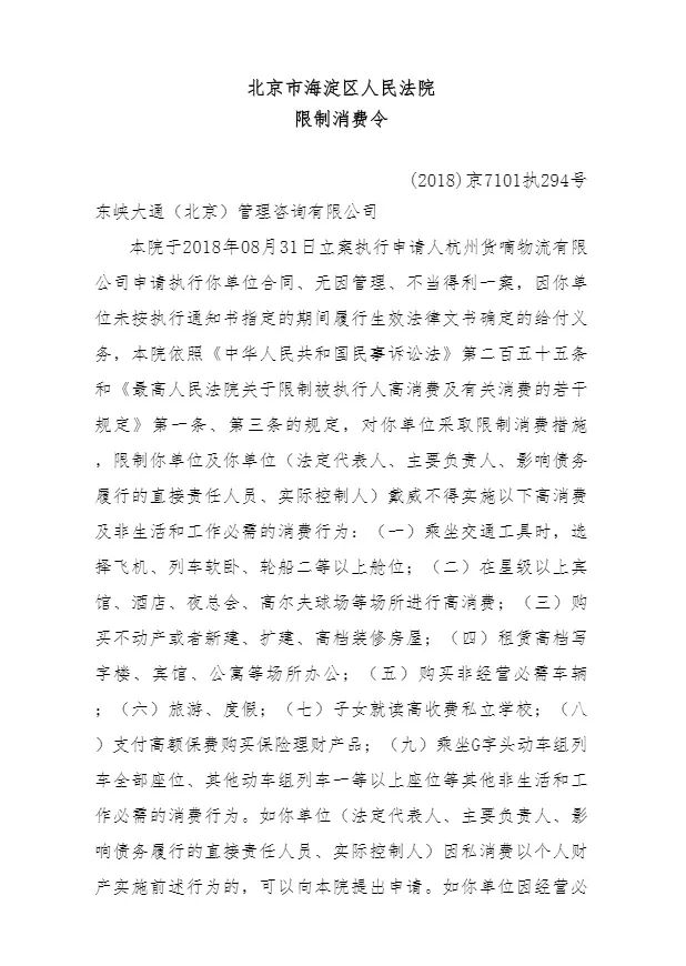 据中国执行信息公开网披露,12月4日,法院对东峡大通(北京)管理咨询有限公司作出了“限制消费令”,该公司和戴威不得选择飞机、列车软卧、轮船二等以上舱位;不能在星级宾馆等场合消费,不能买房买车旅游等。