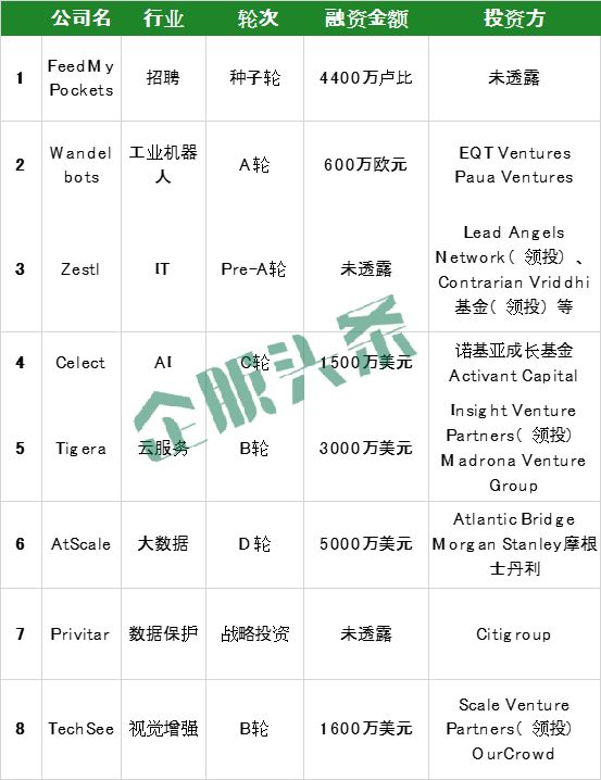上周共收录国外企服领域8起融资,主要集中在8个领域,主要为招聘、工业机器人、IT、人工智能等行业。
