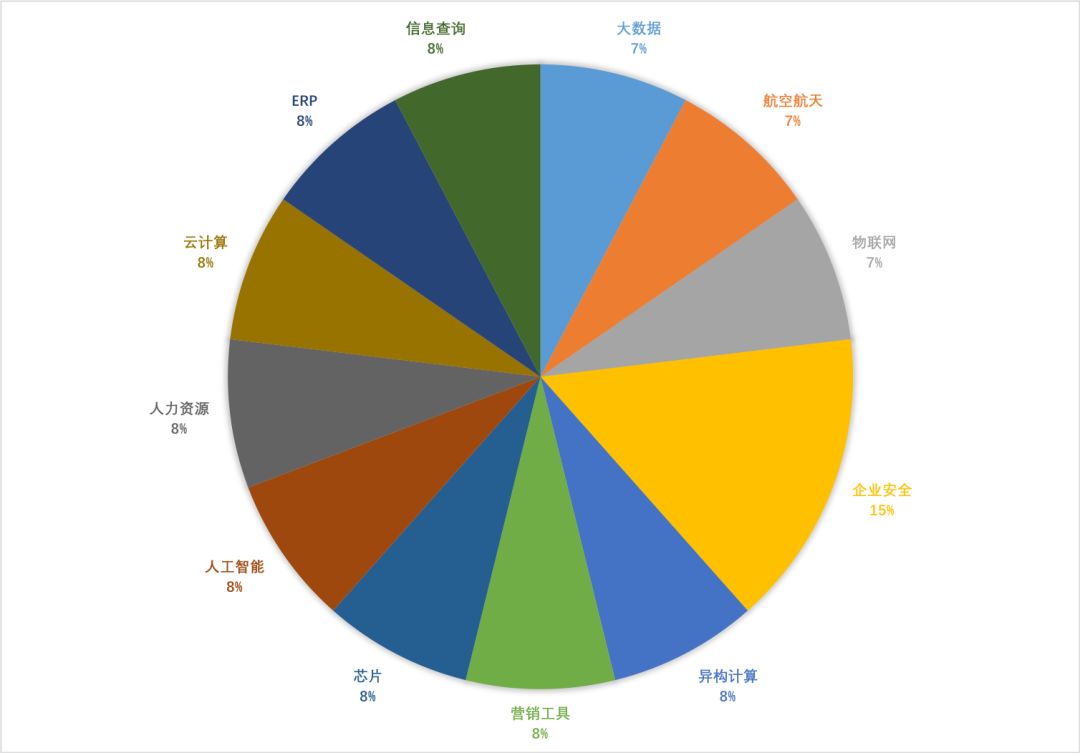 上周国内企服领域共发生13起融资,主要发生在12个领域,除企业安全领域有两笔融资外,其余行业均只有一笔融资。代表企业有360企业安全、Aibee、百分点科技等。