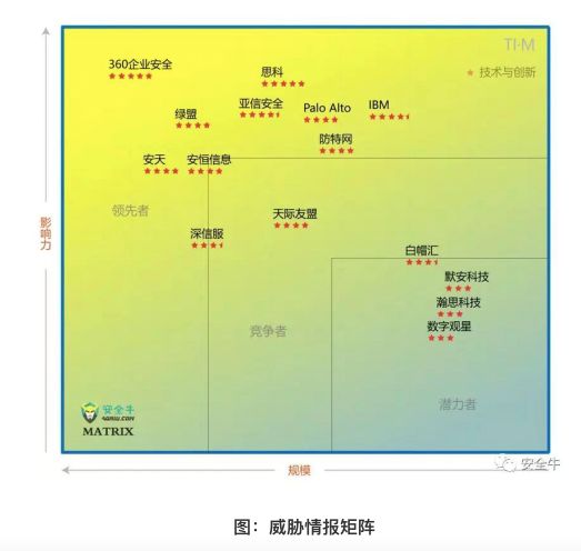 安全牛在今年11月21日发布的《中国网络安全细分领域矩阵图(Matrix 2018.11)》显示,360企业安全集团在威胁情报领域暂时领跑国内市场。