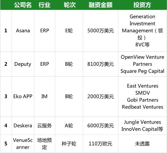 上周共收录国外企服领域5起融资,主要集中在4个领域,分别为ERP、IM、云服务和场地预定。以下为国外企服领域融资汇总: