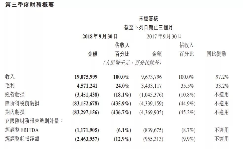 财报显示,Q3美团的营业收入继续保持翻番式增长,实现190.76亿元,较2017年同期的96.74亿元增长97.2%;毛利总额46亿元,较2017年同期增长33.2%;经营亏损35亿元,而去年同期亏损10亿元。