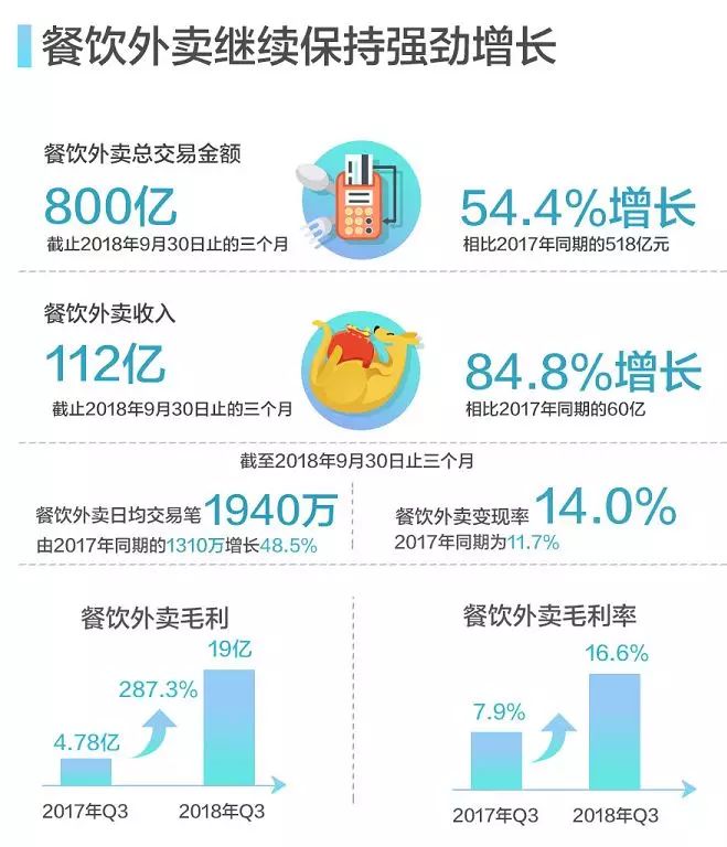 数据显示,由于外卖骑手增加,餐饮外卖分部的销售成本由2017年同期的56亿元增加67.5%至93亿元,增幅低于84.8%的营收增幅。