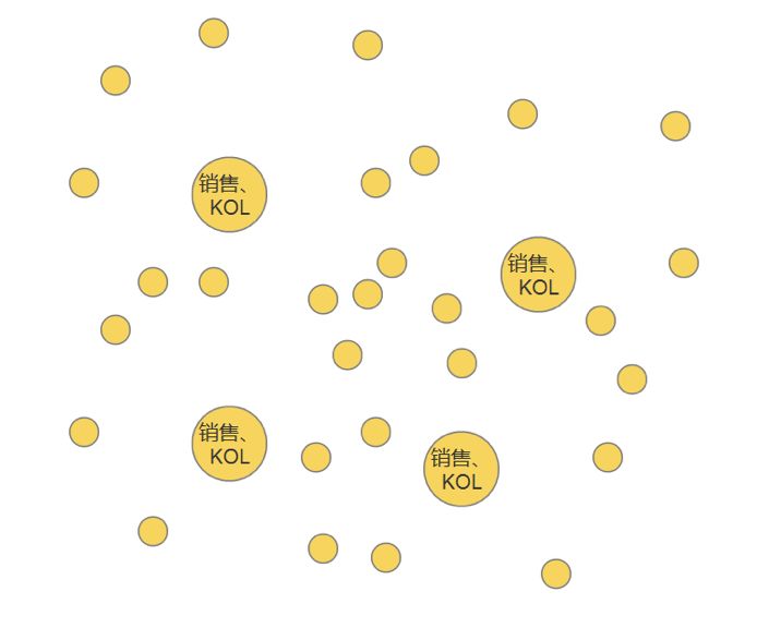 如图所示,可以看到小圆圈代表B端产品的潜在客户,而他们不再是通过广告或者SEM引流到产品官网。而是与企业的销售或者该行业内的意见领袖KOL等建立了一个通路。