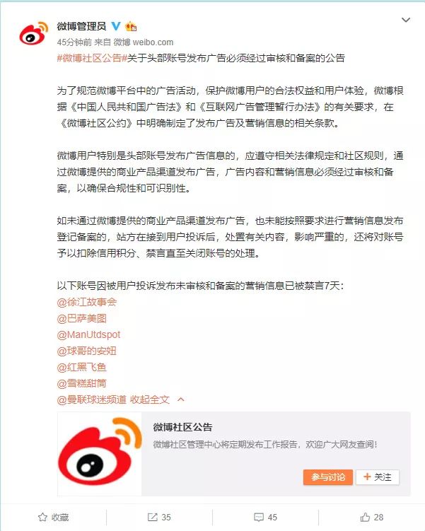 微博:头部账号发布广告须经审核备案,若违规或被禁言封号