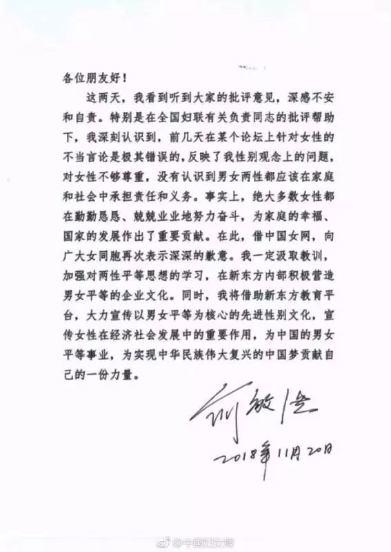 俞敏洪来到全国妇联向女同胞诚恳道歉:深感不安自责