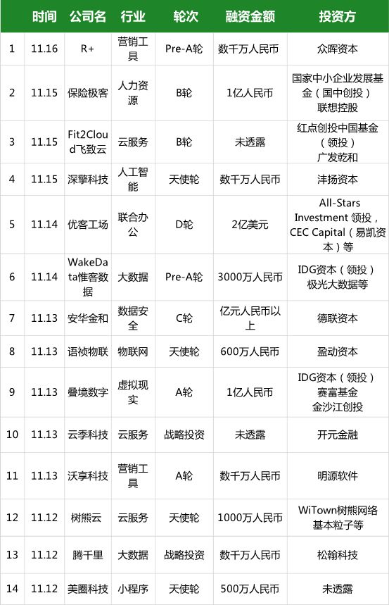 优客工场本轮融资由 All-Stars Investment 领投,CEC Capital(易凯资本)等投资方参投。优客工场在一份声明中表示,此轮融资后,其估值将达到 30 亿美元。以下为国内企服领域融资汇总表: