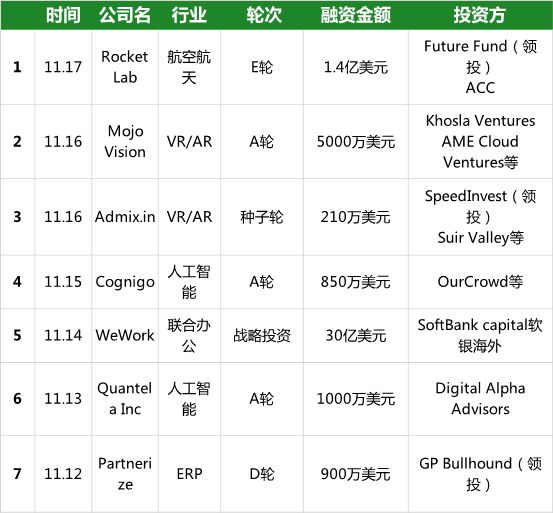 上周共收录国外企服领域7起融资,主要集中在5个领域,分别为航空航天、VR/AR、联合办公、人工智能、ERP。以下为国外企服领域融资汇总: