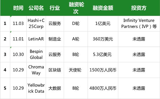 上周共收录国外企服领域5起融资,主要集中在4个领域,分别为云服务、制造业、大数据和区块链。以下为国外企服领域融资汇总: