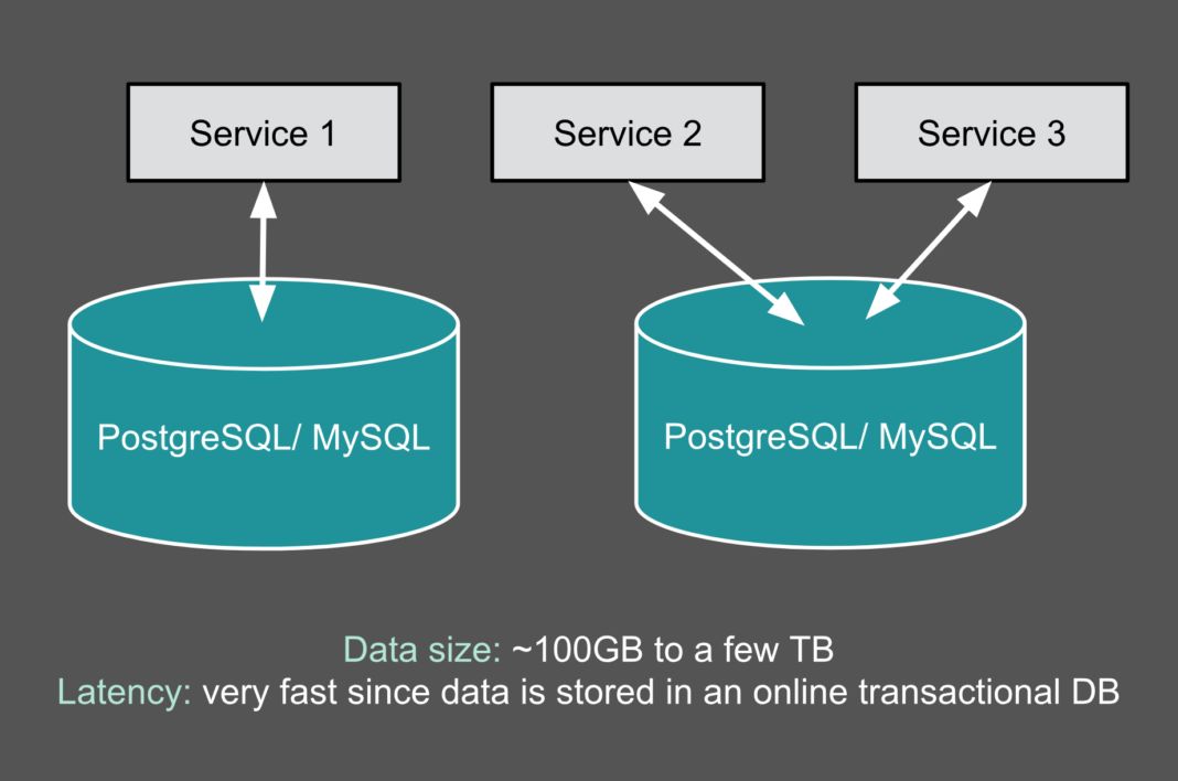 在 2014 年之前,我们有限的数据量可以塞进一些传统的联机事务处理 (OLTP) 数据库中(例如 MySQL 和 PostgreSQL)。为了利用这些数据,我们的工程师必须单独访问每个数据库或表,如果用户想将不同数据库的数据组合起来,需要自己编写代码。当时,我们还没有对所有存储的数据进行全局访问的需求,也没有这些数据的全局视图。事实上,我们的数据分散在不同的 OLTP 数据库中,总数据大小约为几 TB,访问这些数据的延迟非常短 (通常不到一分钟)。图 1 是我们在 2014 年之前的数据架构概览: