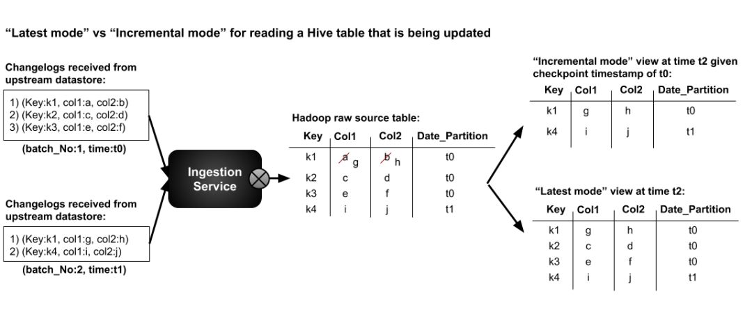 为了向 Hadoop 表的用户提供访问所有数据或仅访问新数据或更新数据的不同选项,使用 Hudi 存储格式的 Hadoop 原始表提供了两种不同的读取模式: