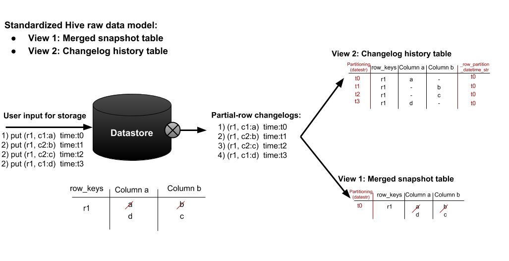 图 7 描述了如何使用给定变更日志流为特定上游源数据存储生成不同的 Hive 原始表: