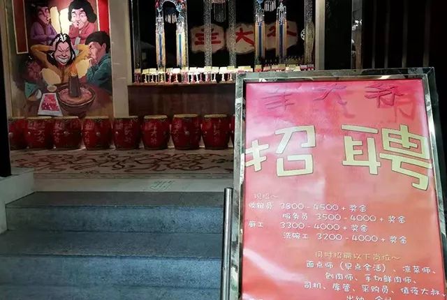 在北京亮马桥,一家名为羊大爷涮肉的餐厅两扇木门上各雕有一个羊头,门口一幅红底黄字的招聘海报显得异常突兀。店内的服务员告诉新经济100人,自她半年前到这边上班起,这个海报就一直放在门口,他们店也一直在招人。
