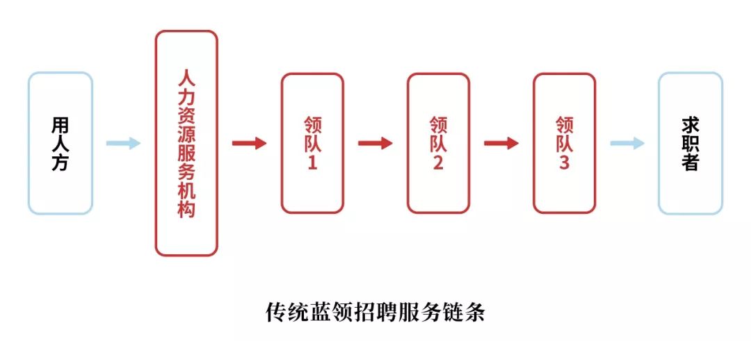 传统的招聘链条中,用人方对接线下的人力资源服务机构,也就是传统的职介所。人力资源服务机构通过领队来招人,领队再分包下去。斗米北京大区负责人许卫介绍,领队一般可以分为大、中、小三层,每层靠着抽取工资差价盈利。