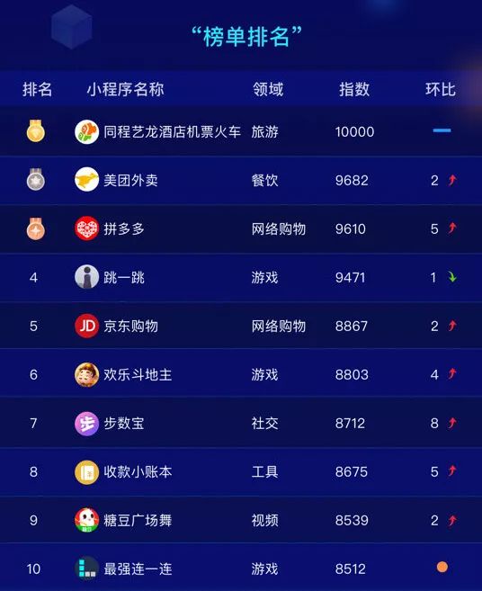 阿拉丁小程序数据统计平台发布2018年10月微信小程度报告,在微信小程序10月TOP100榜单中,同程艺龙酒店机票火车、美团外卖、拼多多、跳一跳、京东购物排名前五。
