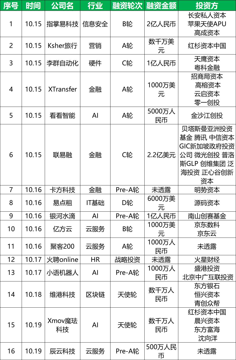 融资金额最高的企业为供应链金融服务平台联易融,其本轮(C轮)融资获得了超过2.2亿美元,由新加坡政府投资公司(GIC)领投,BAI(贝塔斯曼亚洲投资基金)超额跟投,腾讯、中信资本、正心谷等老股东也跟投了此次融资。参与本轮投资的还包括普洛斯、创维、泛海投资、微光创投等新晋投资机构,招商局创投完成转股。