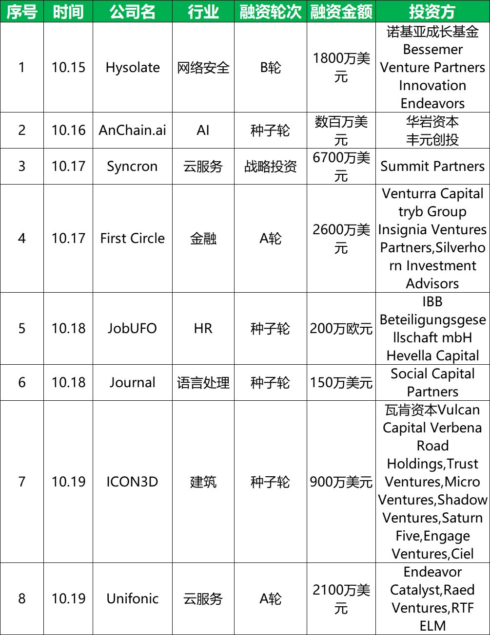 本周共收录国外企服领域8起融资,主要集中在云服务、网络安全、人工智能、金融等7个领域。