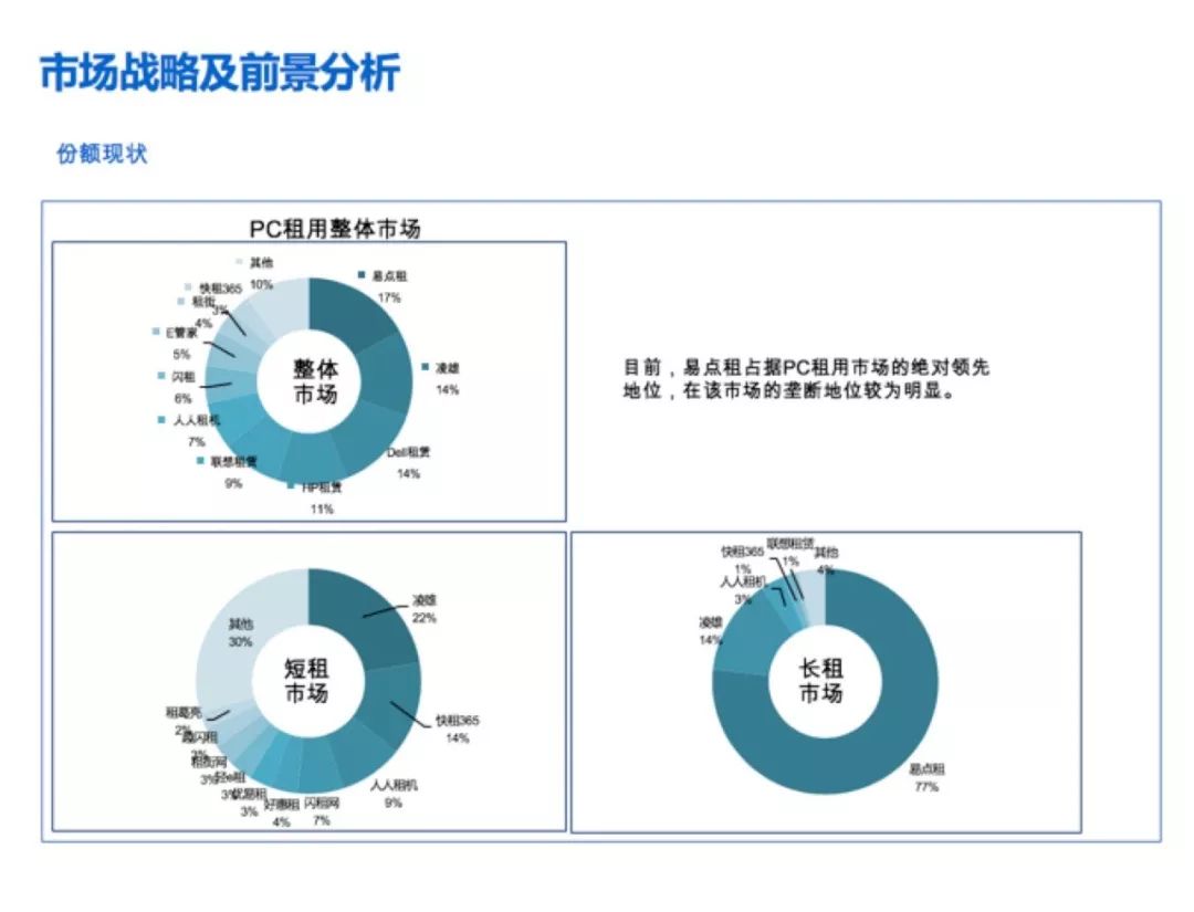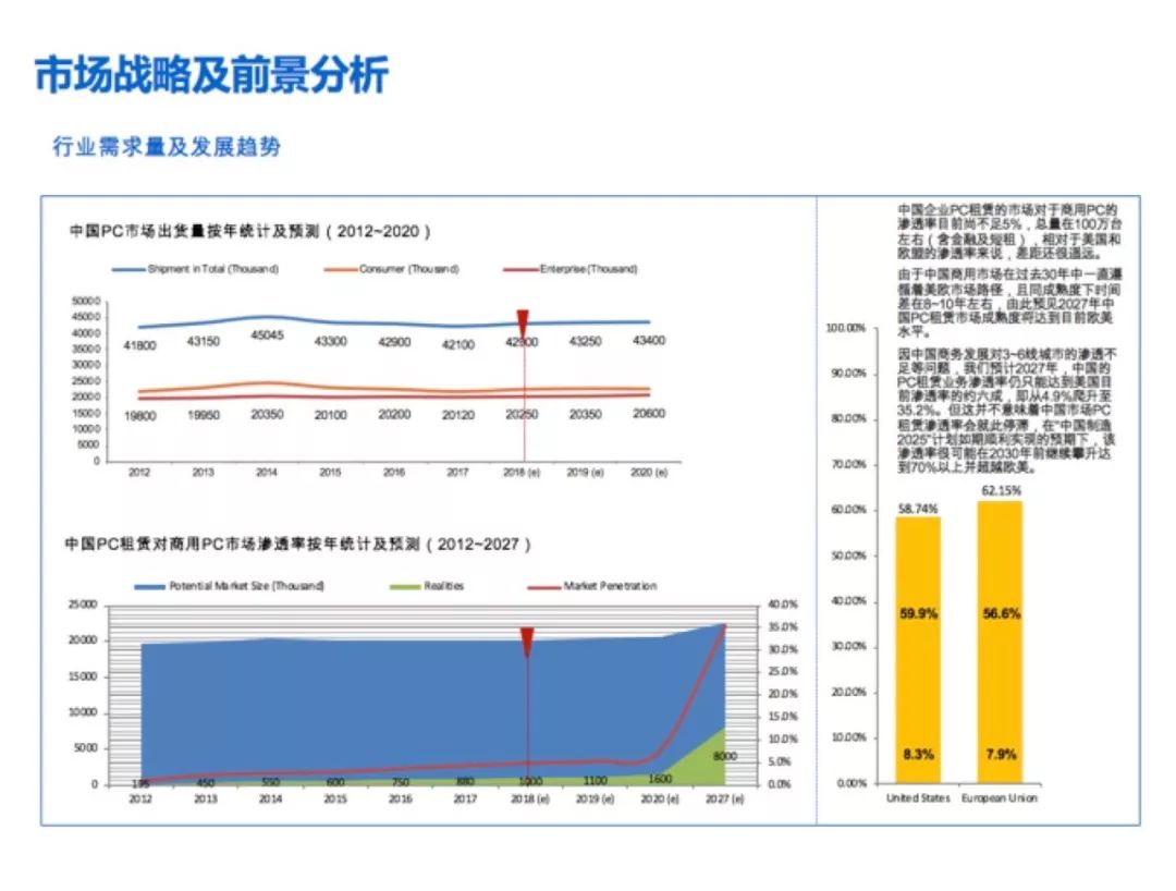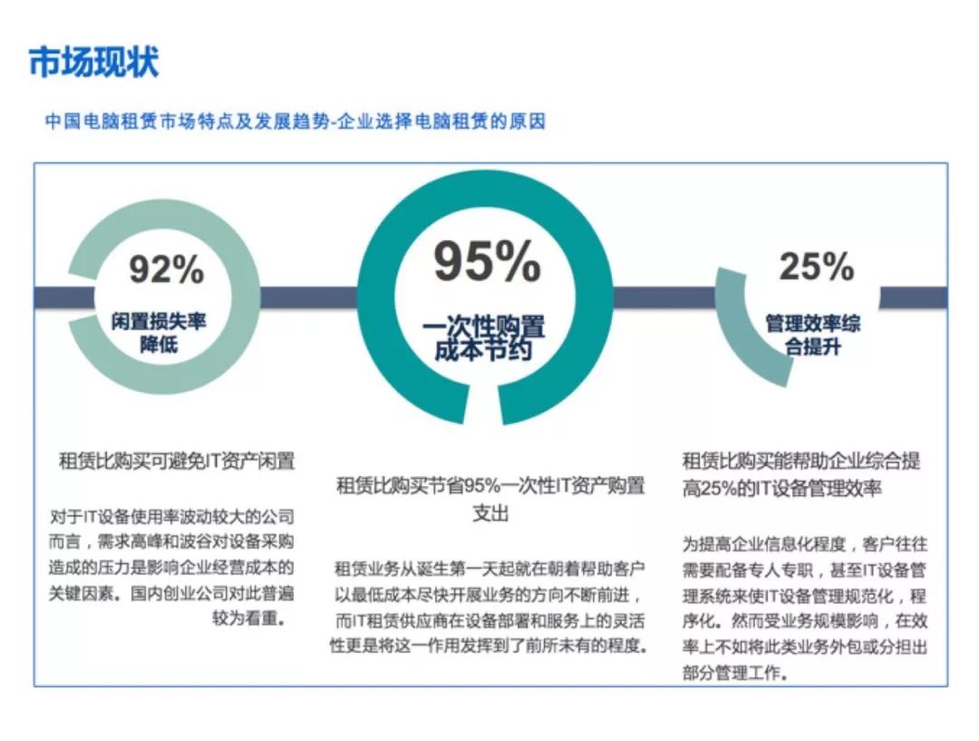 易点租联合DBI咨询发布的“2018-中国电脑租赁市场战略及预测报告”调研结果显示,目前中国电脑租赁市场的特点显示为:“市场潜力巨大,办公PC租赁渗透不足5%,相较于海外市场59%的渗透率来说,未来还有较大开拓空间。”