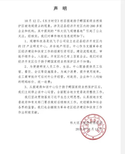 10月12日,《东方时空》曝光了科大讯飞在安徽扬子鳄国家级自然保护区建设培训基地。对此,科大讯飞回应称,观塘科技岛是讯飞子公司设立在泾县经济开发区内的IT产业研发中心,并非地产项目。科大讯飞表示,从报道得知该中心位于扬子鳄国家级自然保护区后,立刻停止该中心运营,全面配合地方党委政府整改工作。