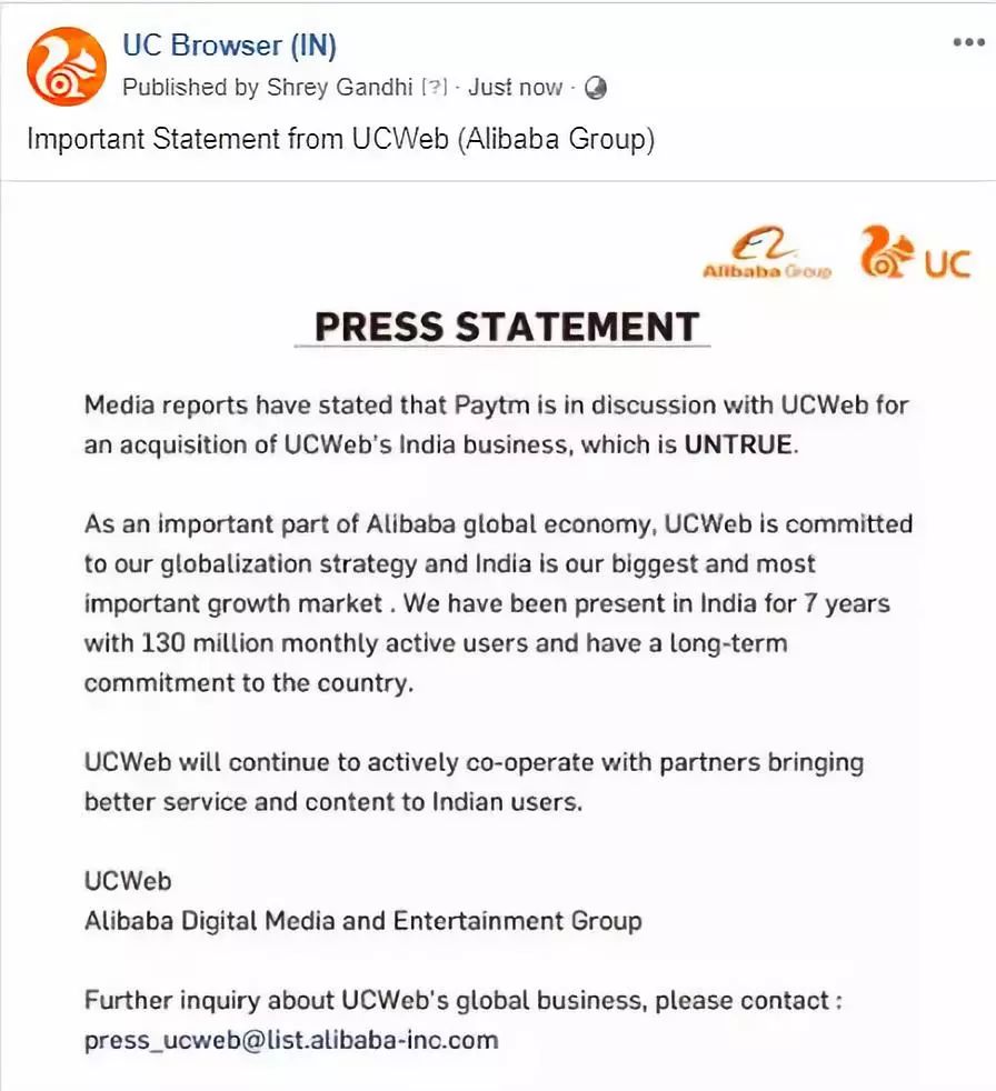 阿里巴巴称Paytm计划收购UC印度业务传闻不属实