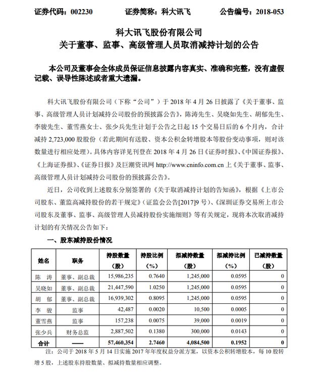科大讯飞:陈涛等6名高管取消减持计划