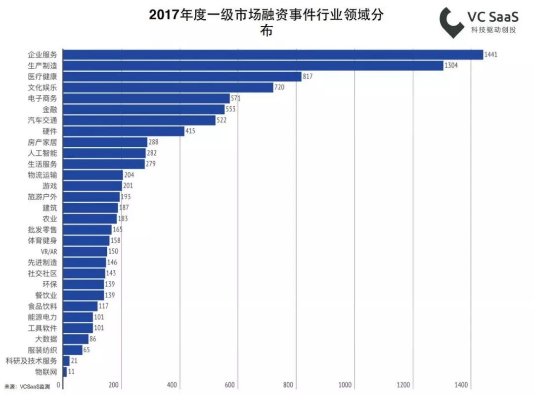 根据VC SaaS实时监控全网公开数据,2017年度创业趋势聚焦于企业服务、生产制造、医疗健康、文化娱乐、电子商务、金融和汽车交通等领域。其中企业服务领域投融资事件共1441起,占总投资事件数的14.85%,位列第一;位列第二的是生产制造领域投融资事件共1304起,占总投资事件数的13.44%。