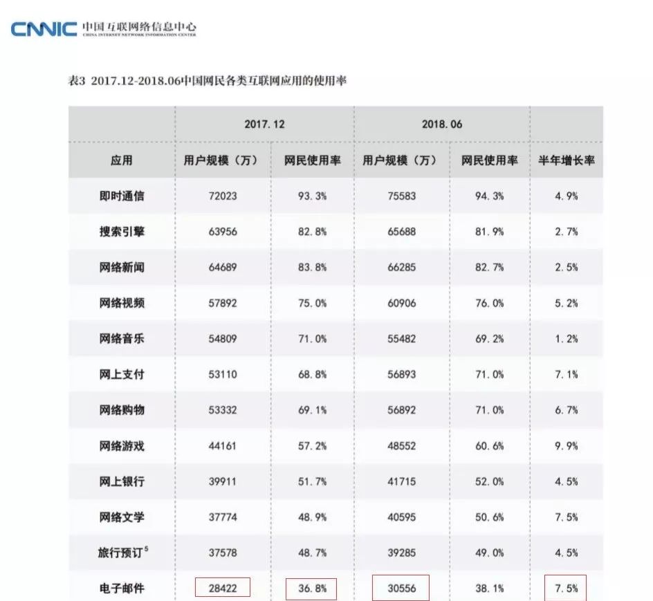 根据CNNIC的一项互联网应用使用率调查报告显示,电子邮件在互联网应用中国年排名第12,用户规模大约在2.8亿,在2018年半年间,仍然保持7.5%的增长率,仅仅落后于网络游戏9.9%的增长率。