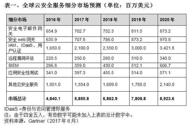 根据Gartner2017年6月的预测,全球云安全服务将保持强劲增长势头,在2017年达到59亿美元,相比2016年增长21%,云安全服务市场将在2020年接近90亿美元。