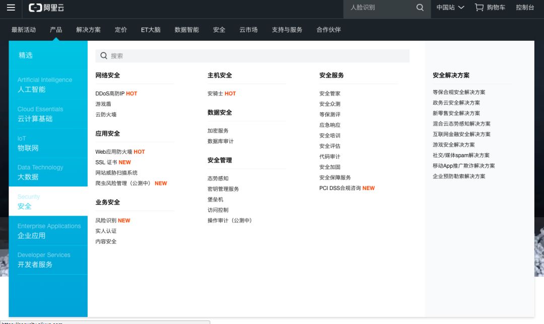 浏览阿里云(云盾)的安全产品目录我们发现,阿里云盾的安全防护分为网络、主机、应用、数据、业务安全等多个维度,其中DDoS高防IP、Web应用防火墙、主机安全中的安骑士被标为hot,与上文Gartner对全球云安全市场的主攻点分析基本一致。