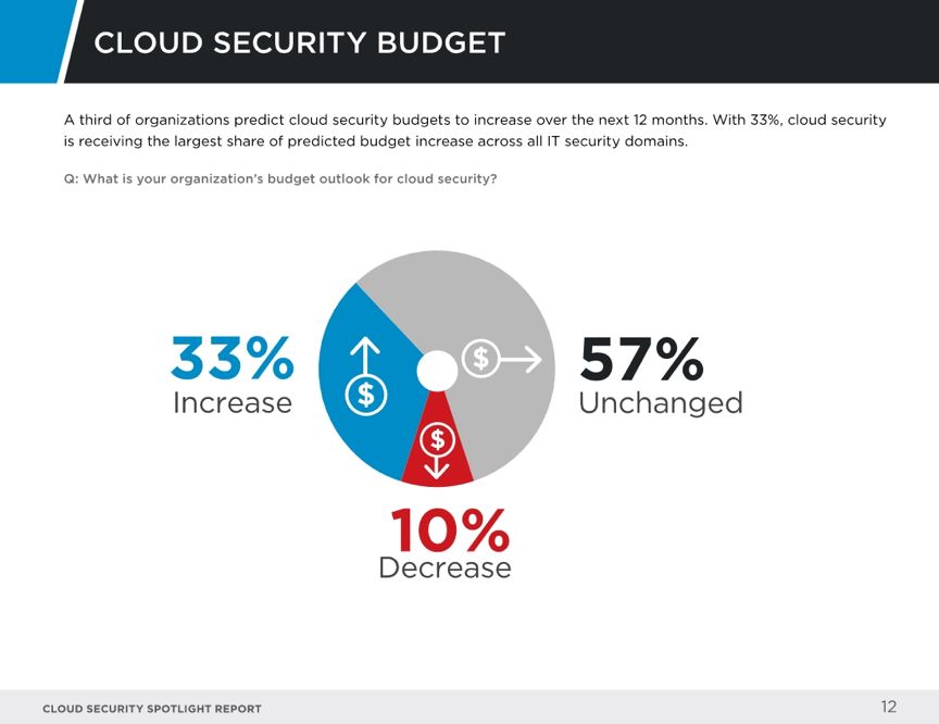Crowd Research最新的“2017年云安全报告”调查了35,000多个信息安全社群的网络安全专业人士,其中有1/3的企业都表示将在未来12个月内增加云安全预算。同时,云安全在IT安全各领域预算增长中占有最大份额,达到了33%。