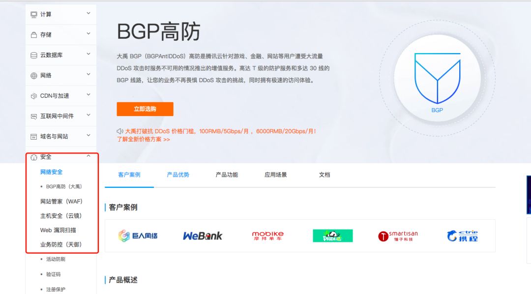 腾讯云(大禹)也优先将安防力量放在了BGP高防(抗DDoS攻击)、网站管家(WAF)、主机安全、Web漏斗扫描等层面,与阿里云在安全方面的布局方向也并没有太大区别。